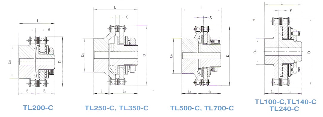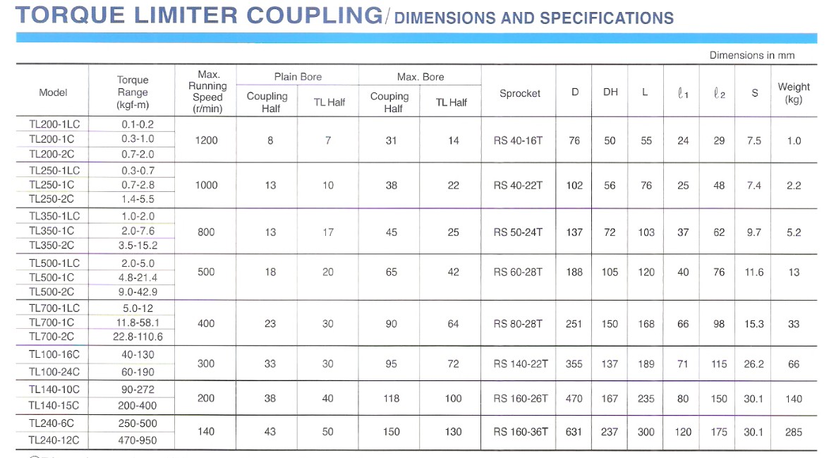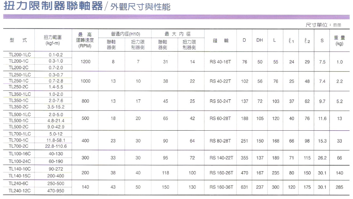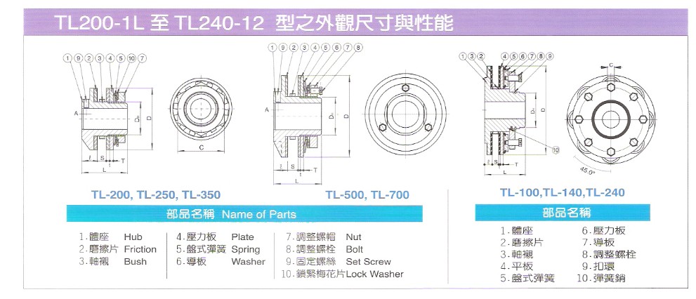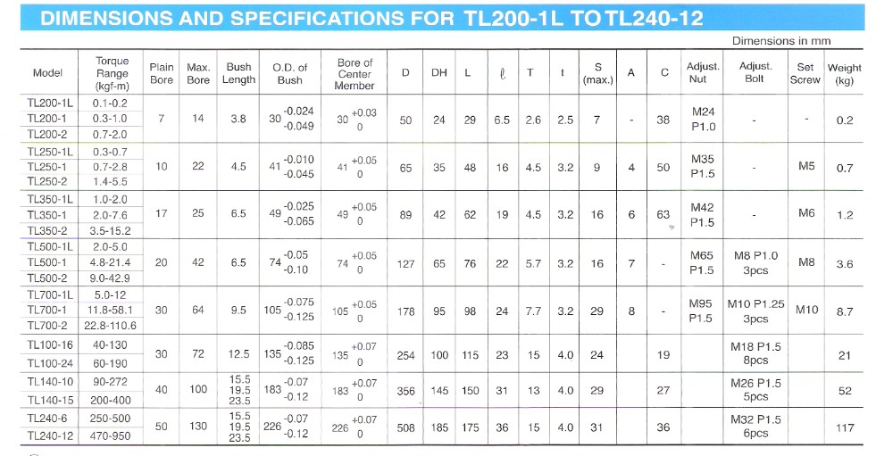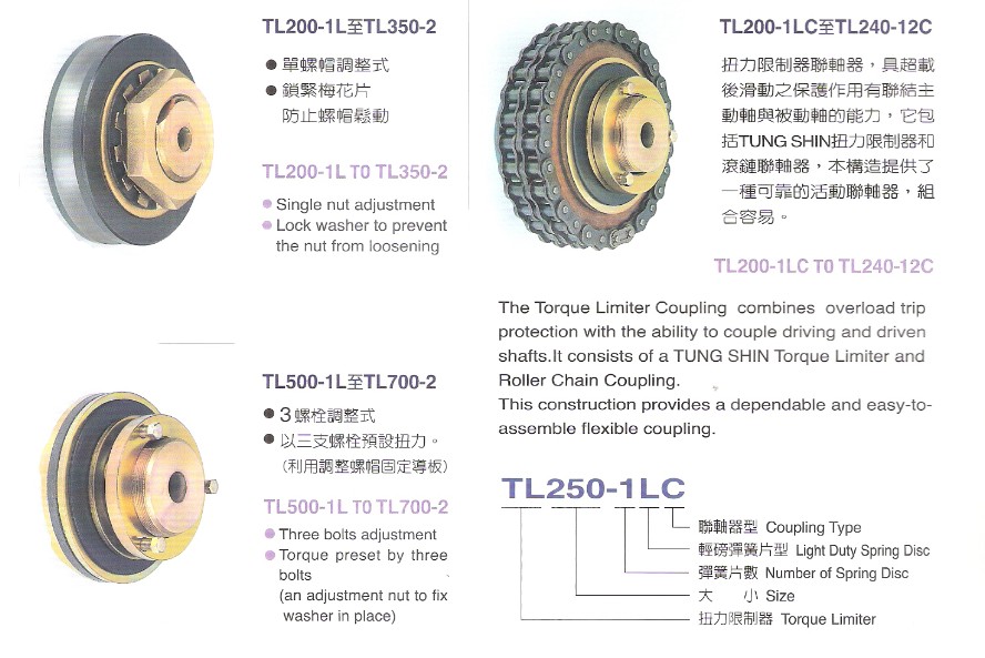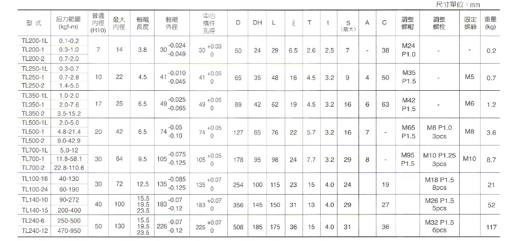扭力限制器的扭力設(shè)定只需扭緊或放松調(diào)整螺帽及/或調(diào)整螺栓便可。TL200至TL350型各具一調(diào)整螺帽,TL500-TL240型則各具數(shù)個(gè)調(diào)