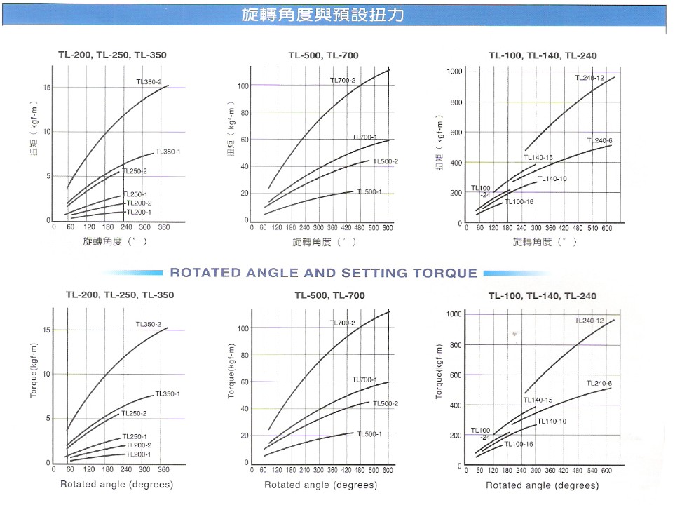 Then,if the Torque Limiter trips under normal loading conditions,tighten the nut (for TL200 to TL350) or the bolts (for TL500 to TL240) gradually until the torque limiter stops tripping.Always tighten(or loosen)the bolts equally.Try this adjusmtent several times to find the proper torque setting for the machine.For your guidance,the charts hereunder shows the relation between the effective rotated angle and preset torque.