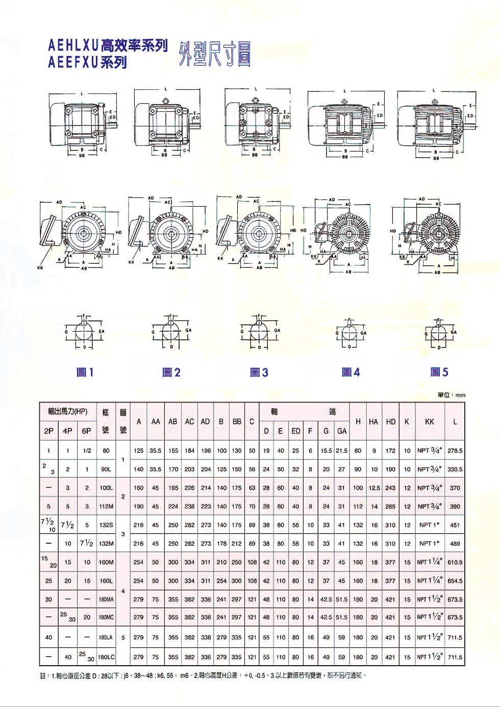 產(chǎn)品系列:AEEFXA / AEVFXA   產(chǎn)品規(guī)格: 額定輸出 1/4~125HP 極數(shù)(P) 2、4、6 電壓(v) 200~460 頻率(Hz) 50、60 機(jī)座號(hào)(F#) 63~A250MC 防護(hù)等級(jí) IP54 冷卻方式 IC411